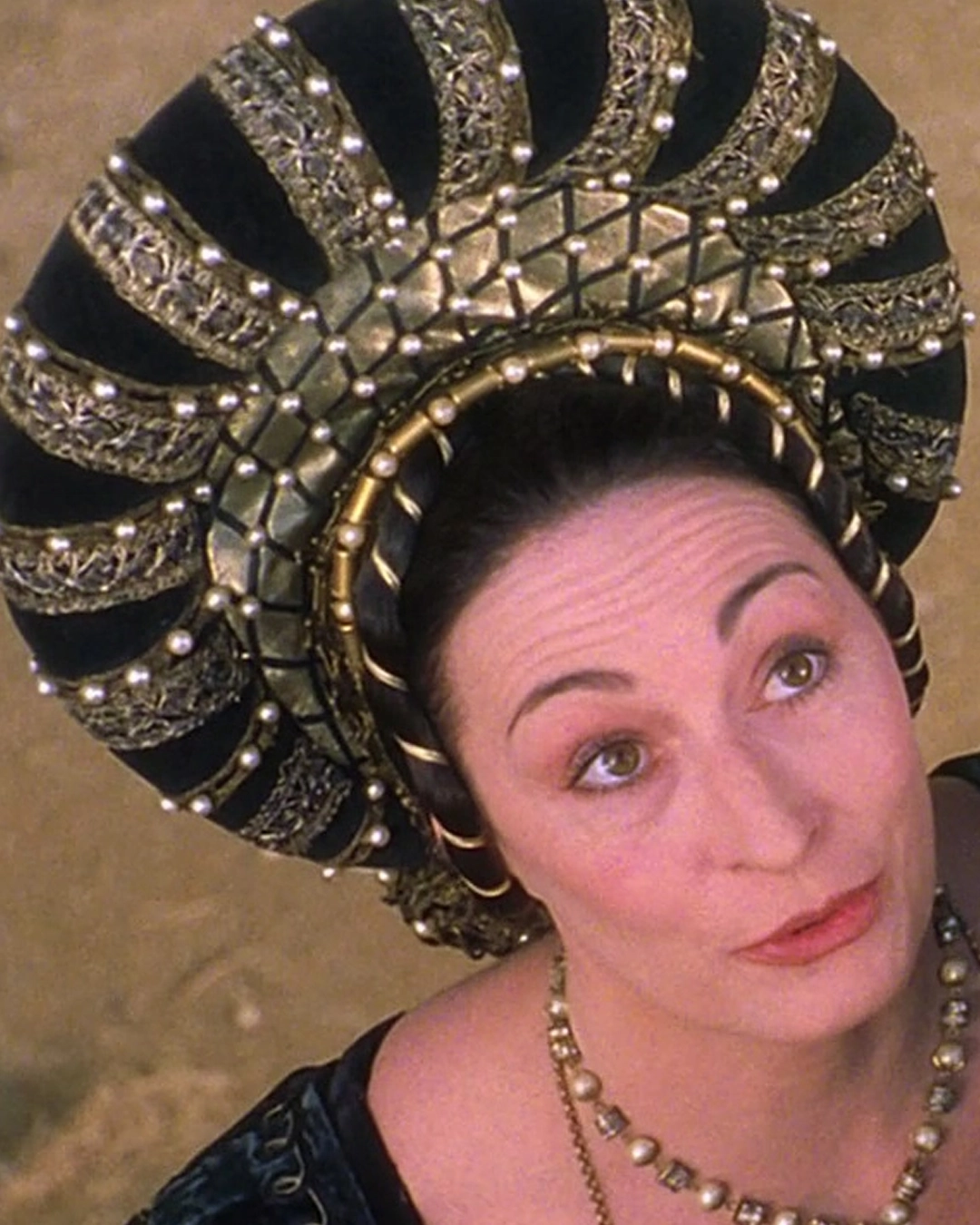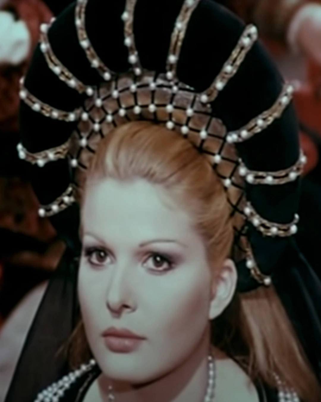 This headdress was most likely made for the 1968 film Lucrezia, where it was worn by Olga Schoberová in the title role.