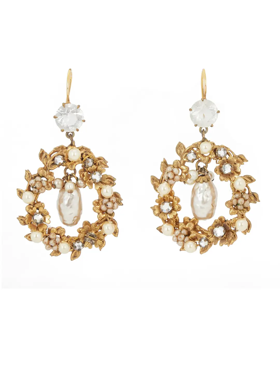 This pair of earrings by Joseff of Hollywood – made of goldplate metal in the form of a floral wreath with added faux pearls and rhinestones were likely converted from clipbacks to hooks years later, as Joseff changed and adapted their pieces over the years as needed.