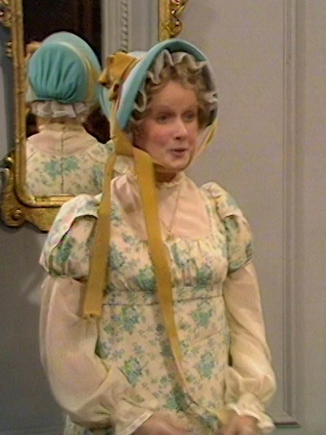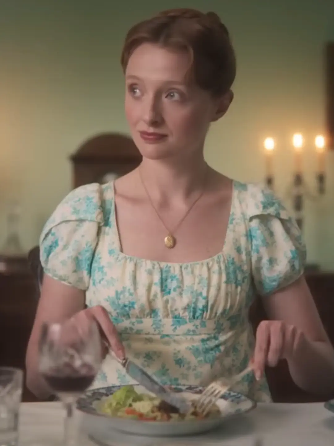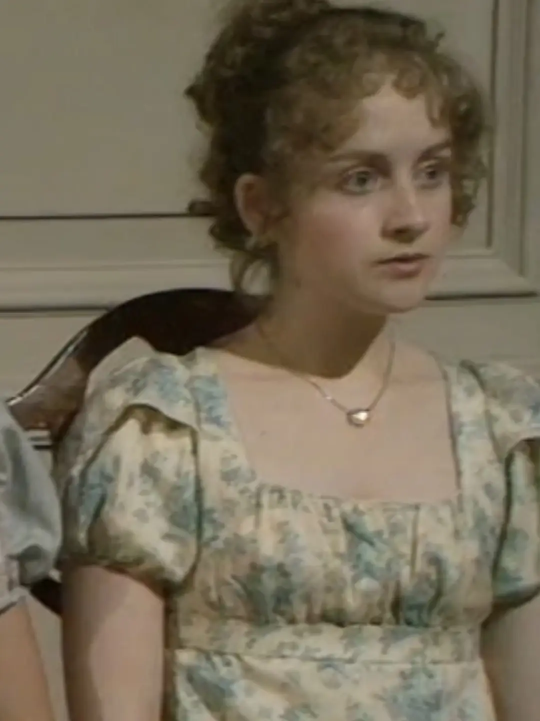This floral dress likely originated in the 1972 production of Emma, where Debbie Bowen wore it as Harriet Smith. It was seen again on Natalie Ogle in the 1980 adaptation of Pride and Prejudice in the role of Lydia Bennet. The latest appearance was in the 2026 BBC series The Other Bennet Sister on Poppy Gilbert as Lizzie Bennet.