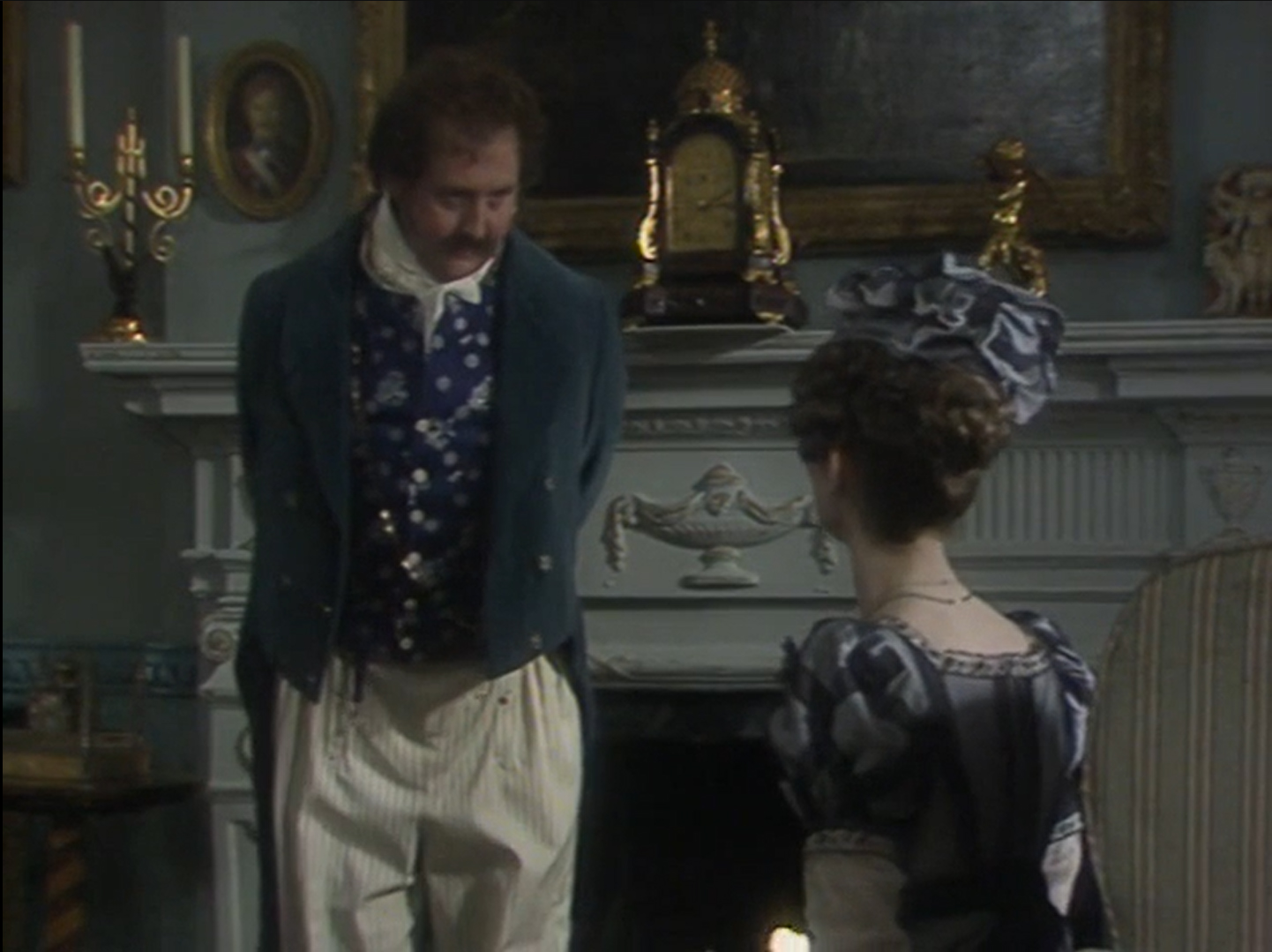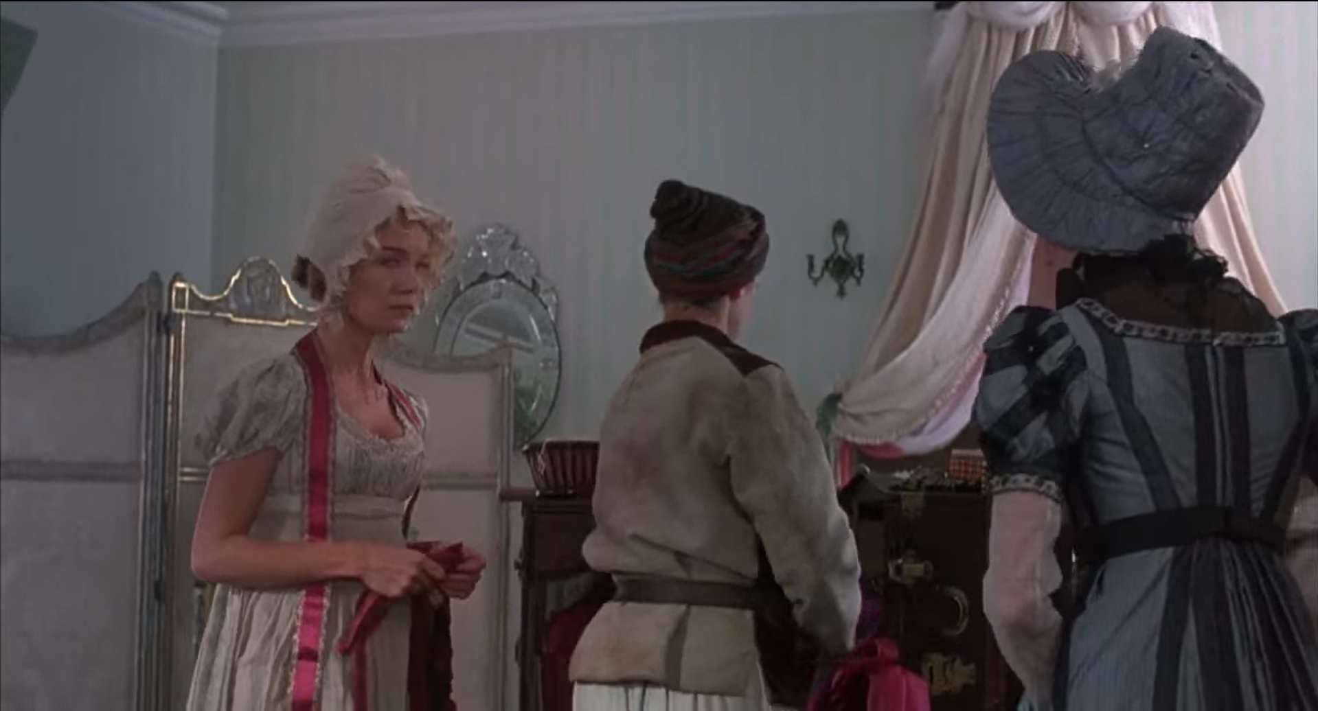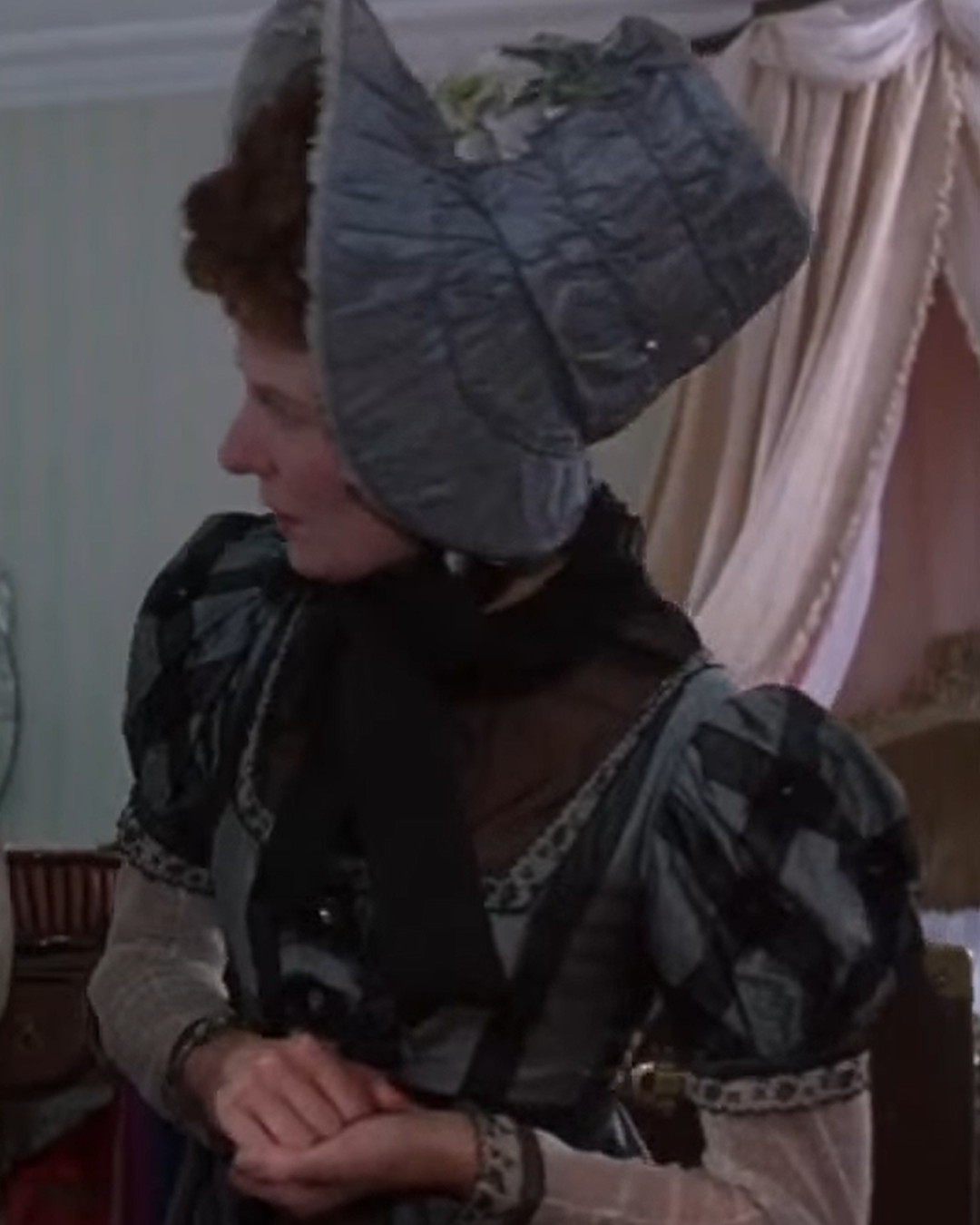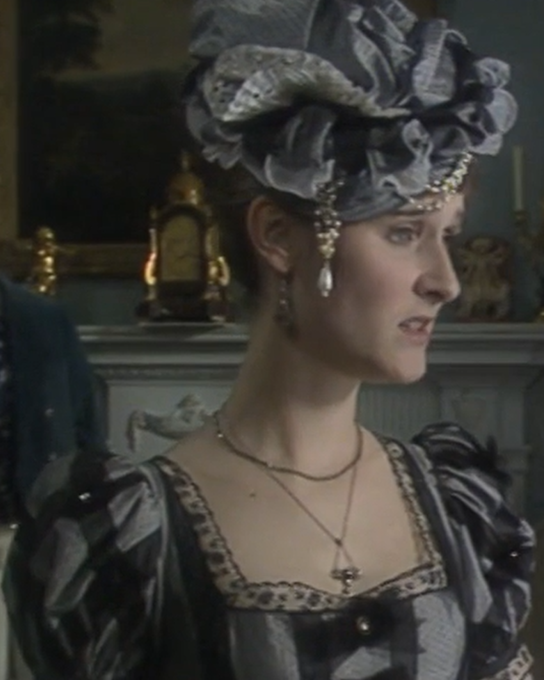 This rather interesting black and blue costume was likely created by Joyce Hawkins for the 1987 BBC adaptation of Vanity Fair, where it made its debut on Rebecca Saire as Amelia Sedley. It was reused on an extra in the 1994 film Princess Caraboo.