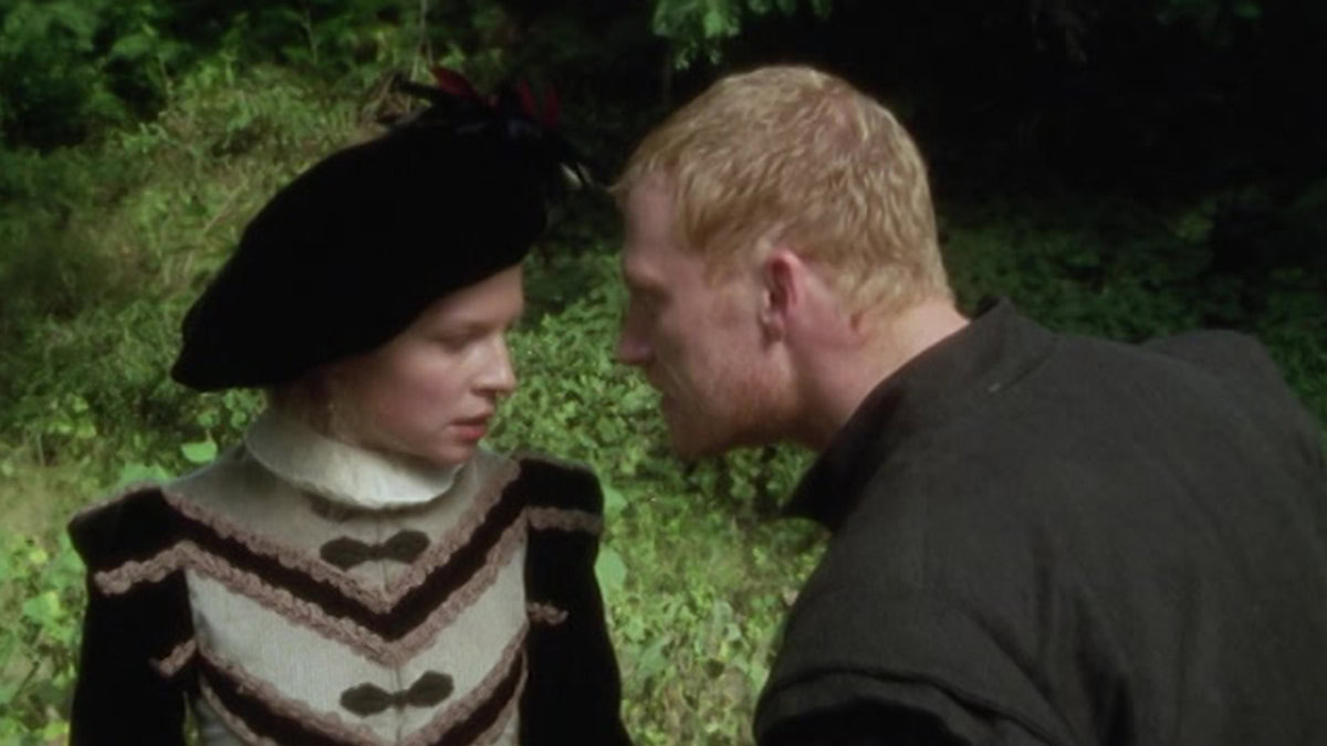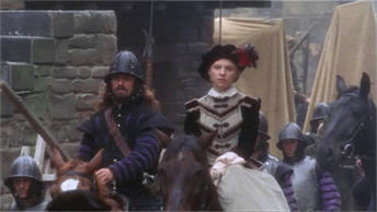 • Clemence Posey as Mary, Queen of Scots wearing a black, white, and tan riding habit in the 2004 mini-series "Gunpowder, Treason and Plot."