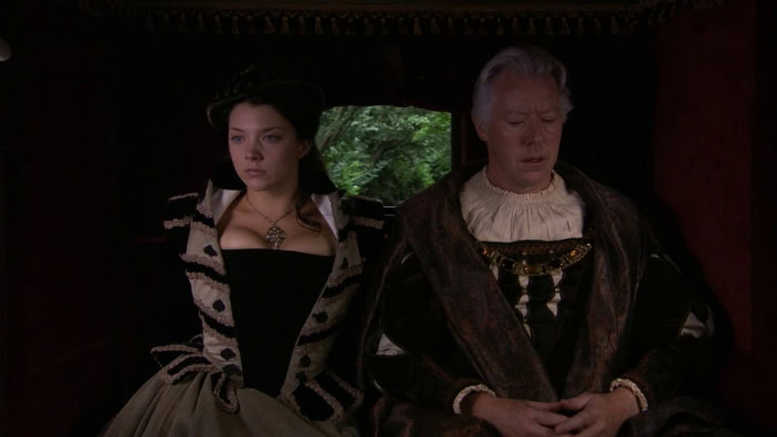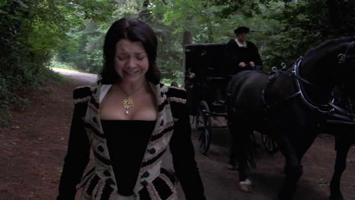 • Natalie Dormer as Anne Boleyn wearing a black, white, and tan riding habit in the 2007 series "The Tudors."