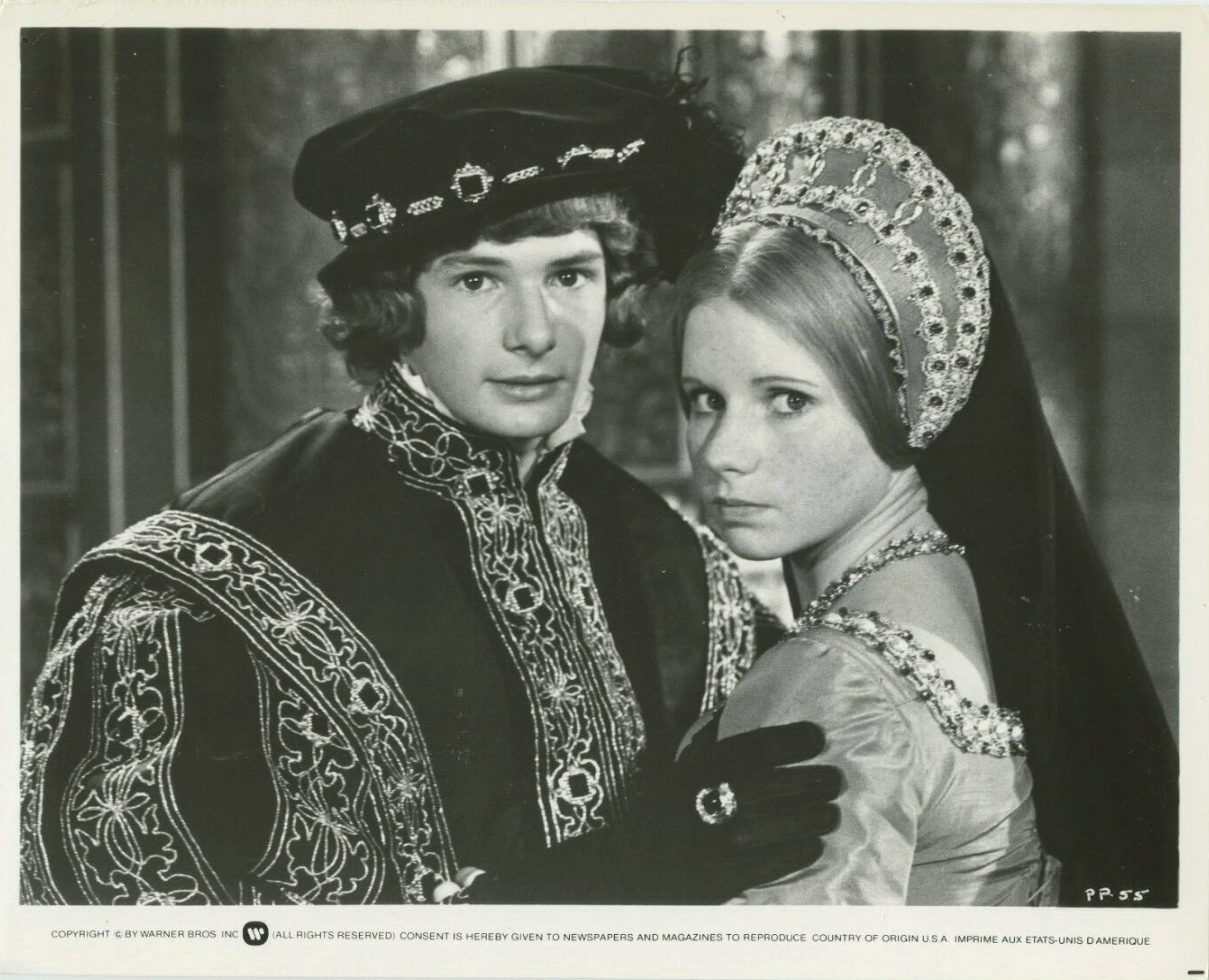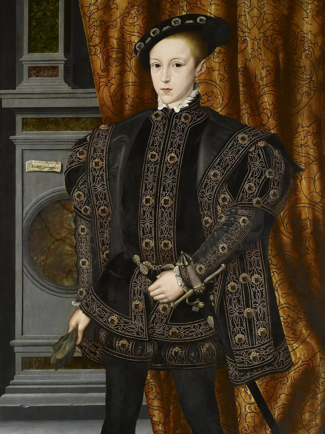 This beautiful costume, modeled after a painting of Edward VI by Scrots was first worn by Mark Lester as Edward VI in Crossed Swords, or The Prince and the Pauper (the film can be found under both names).