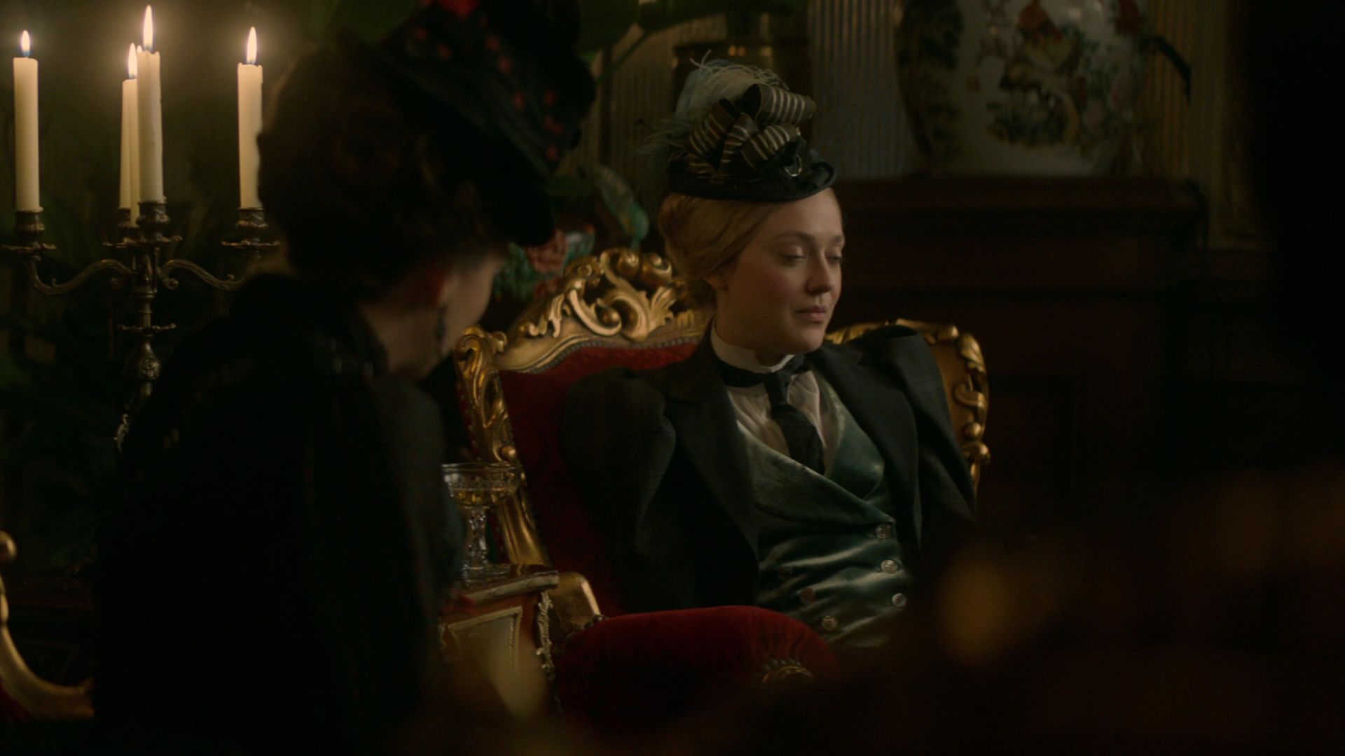 The five-striped ribbon is indeed impressively alike. But the hat on Billie Piper looks like made from a (bit wobbly) straw body – while the one on Dakota Fanning looks firmer and like covered in or made from a smoother textile. Damask, moiree or some other woven one. Stripping and re-covering the straw/paper hat in textile would be such an effort, I’d say they’re two hats who happened to be decorated with the same wide ribbon.